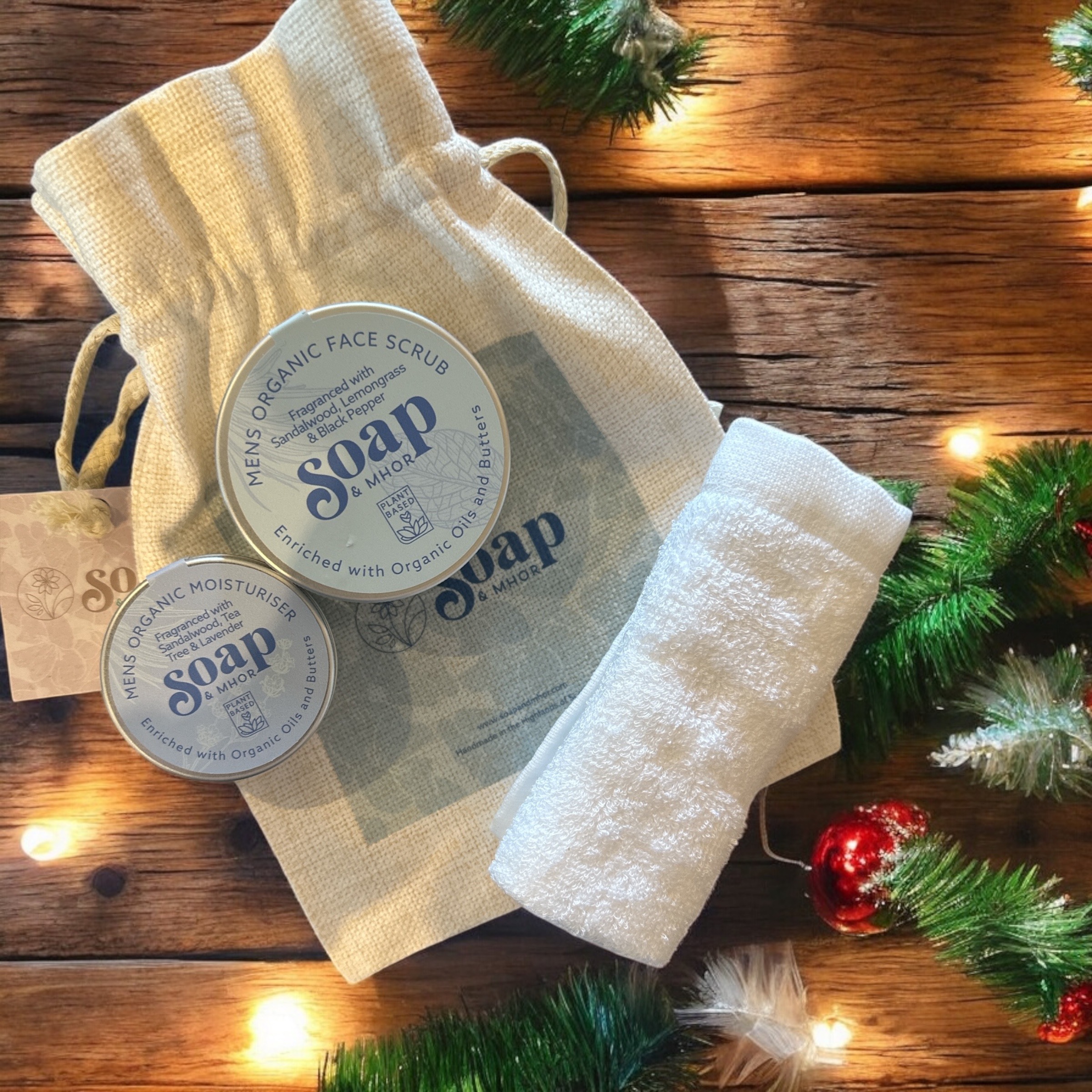 A natural, vegan-friendly gift set featuring a 100ml organic face scrub, 50ml organic moisturiser and a soft bamboo cloth, all packaged in a reusable men’s gift bag.