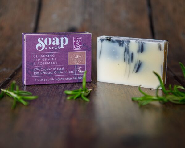 A refreshing soap bar with peppermint and rosemary essential oils stimulates and cleanses your skin. It is crafted with organic oils and shea butter for a moisturising and soothing wash. It is handmade in the Highlands of Scotland.